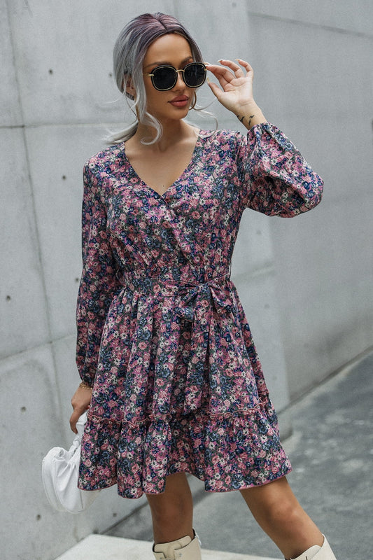 Floral Print Tie Waist Surplice Neck Mini Dress