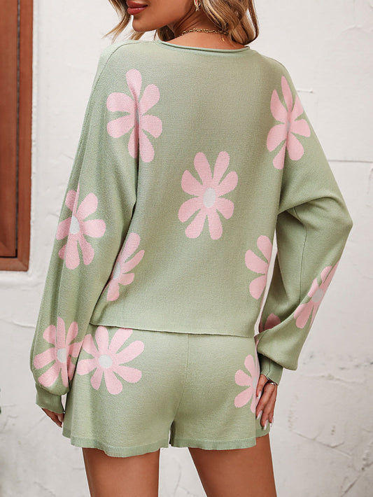 Floral Print Raglan Sleeve Knit Top and Tie Front Sweater Shorts Set